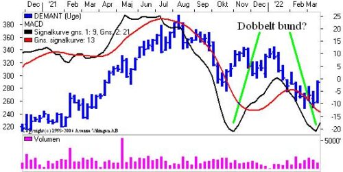 Demants aktiekurs toppede i august i niveauet 390 og har siden været i en faldende tendens frem til slutningen af februar, hvor aktiekursen fandt et stabilt leje i niveauet 250-270. Torsdag lukkede aktien i 289,90 og der er etableret en svagt stigende tendens.