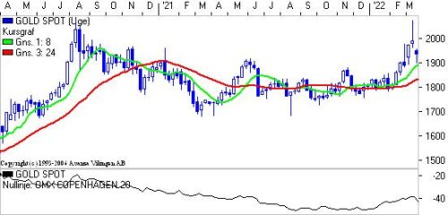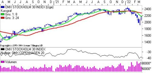 På ugebasis skal kursen over 2300, før signalet skifter i Bollingerkanalen og Parabolic-modellen. Det korte glidende gennemsnit ligger i niveauet 2175 som en modstandslinie som i øjeblikket bliver testet og det lange glidende gennemsnit ligger i niveauet 2275 som den næste modstandslinie.