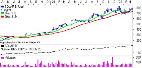 Solar har været et af de selskaber som har klaret sig bedre i den seneste tids uro uden de store udfald. Aktien blev handlet i 810 i starten af januar og ramte 650 i slutningen af januar, men faldet har ikke betydet, at den positive tendens er blevet brudt.