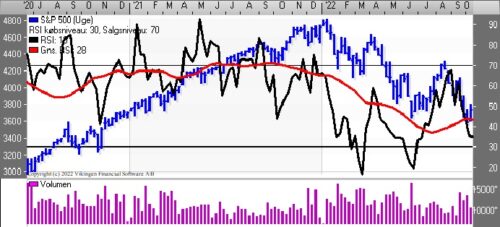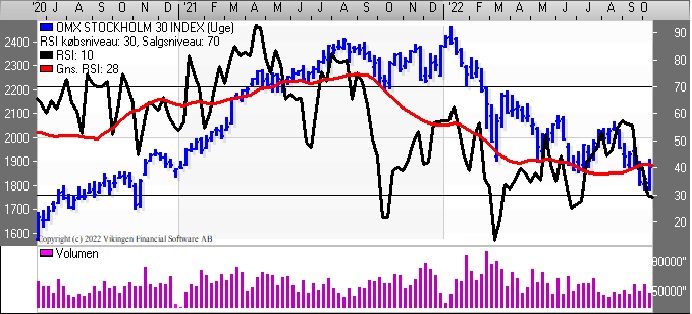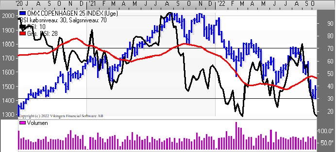 C25-indekset er nede og kysse niveauet 1400 og dermed er indekset faldet med mere end 23 pct. i år. De glidende gennemsnit på 8 og 24 uger har etableret et Death Cross for 2 uger siden. Bollingerkanalen er ligeledes i salg på ugebasis og har været det siden august/september. Faldet i indekset har sendt Momentum, MACD og RSI i en faldende tendens. RSI er under 20 og MACD er under 0. Nærmeste støtteniveau er fortsat ved 1400 og herefter i niveauet 1340-1350, mens der er modstand i niveauet 1550 og herefter i niveauet 1600. Indekset indikerer, at man skal afvente udviklingen, da der er salgssignal i de fleste modeller på ugebasis. På dagsniveauet er de første købssignaler dukket op, men man mangler den stigende tendens.