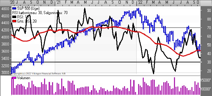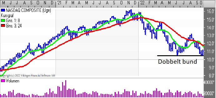 Nasdaq Composite har testet støtteniveauet 10.500 for anden gang. Første bund var i juni/juli og nu igen i oktober. De seneste par dages rebound i markedet har givet købssignal i Bollingerkanalen og det korte glidende gennemsnit er blevet brudt nedefra, mens det lange glidende gennemsnit ligger i niveauet 11.300 som en modstandslinie. På ugebasis er der fortsat salgssignal i Bollingerkanalen og de glidende gennemsnit ligger side om side.