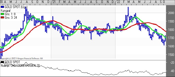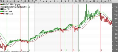Brent Spot stiger igen efter OPEC+ vil sænke olieproduktionen med 1 mio. tønder olie. På dagsniveauet er der etableret et købssignal i Bollingerakanalen og de glidende gennemsnit er blevet brudt igennem nedefra, men der er endnu ikke etableret et Golden Cross.