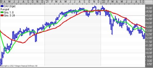 Frankfurt DAX har som flere andre markeder taget en rebound i denne uge og det betyder, at der er etableret købssignal i Bollingerkanalen, og det betyder, at de glidende gennemsnit er blevet brudt nedefra og holder tendensen, bliver der etableret et Golden Cross i løbet af et par dage.