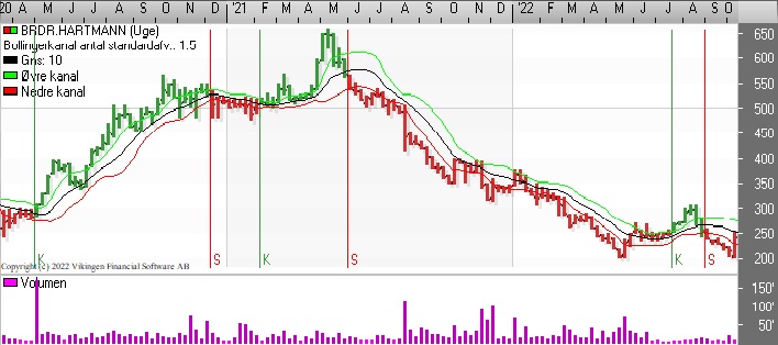 Brdr. Hartmann har igen testet niveauet 205: Første gang var i maj og senest var i begyndelsen af oktober. På dagsniveauet har der været en stigende tendens i aktiekursen de sidste 3 dage. Holder den stigende tendens, bliver der etableret et Golden Cross i næste uge. Bollingerkanalen på dagsniveauet har ligeledes etableret et købssignal for 2 dage siden.
