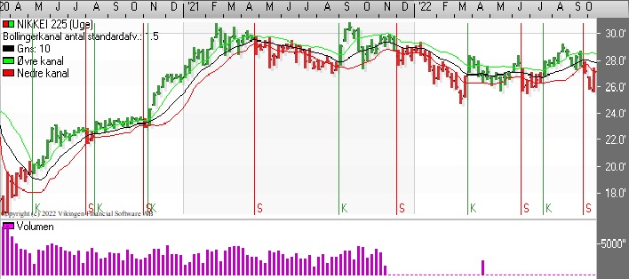 Det japanske marked har rettet sig efter testen af 26.000 i sidste uge. Stigningen betyder, at der er købssignal i Bollingerkanalen og de glidende gennemsnit 8 og 24 er blevet brudt nedefra. På ugebasis er der fortsat salgssignal i Bollingerkanalen og kursen skal over 28.500, før signalet skifter til køb. De glidende gennemsnit 8 og 24 er tæt på at etablere et Death Cross.