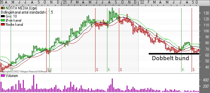 North Media har etableret en dobbelt bund i niveauet 63-65: Den første var i juni og den anden er i slutningen af september. På dagsniveauet er de glidende gennemsnit blevet brudt nedefra og holder tendensen, bliver der etableret et Golden Cross. Bollingerkanalen er ligeledes gået i køb for 4 dage siden.