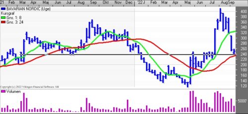 Dagens vinder i et negativt marked var DFDS, som steg med 2,7 pct. I begyndelsen af juli ramte aktien kurs 210 og holder det nuværende niveau ved 240, er der etableret en stigende trend i aktien. Den seneste top var i august i niveauet 310 og skal tendensen holde, er næste top i 320.