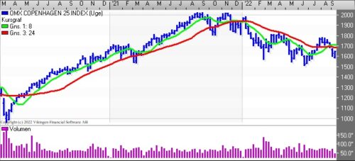 C25-indekset holder fast i støtte niveauet omkring 1600. På dagsniveauet er der salgssignal i Bollingerkanalen og de glidende gennemsnit har etableret et Death Cross i midten af august. På ugebasis er der salgssignal i Bollingerkanalen og de glidende gennemsnit er tæt på at etablere et Death Cross.