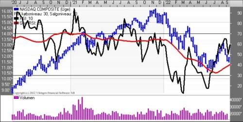 På ugebasis er der købssignal i Bollingerkanalen som i S&P 500, mens der ikke er noget signal i de glidende gennemsnit, da det korte og lange glidende gennemsnit ligger sammen i niveauet 12.200 mod kursudviklingen i grafen i niveauet 11.791.