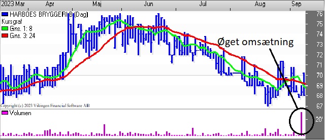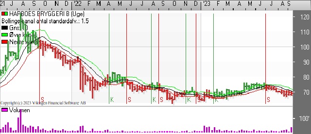 I kategorien ny aktionærsammensætning kan nævnes Harboes Bryggeri. Aktien er handlet vandret i niveauet 65-75 siden juni 2022. Der er divergens mellem signalerne på dagsniveauet, idet Bollingerkanalen er i salg, mens de glidende gennemsnit netop har etableret et Golden Cross for 2 dage siden.