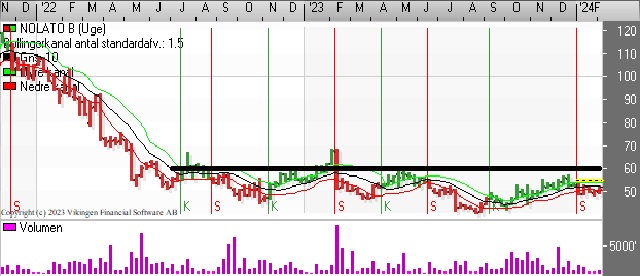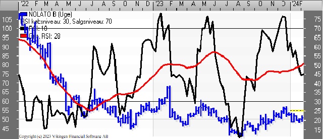 Teknisk set har Nolato-aktien bevæget sig vandret i niveauet 50–70 siden juni 2022. Bollingerkanalen på dagsniveauet har etableret et købssignal for 3 dage siden. De glidende gennemsnit på 8 og 24 dage er ved at etablere et Golden Cross, da de begge er brudt af den stigende tendens i kursen.