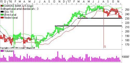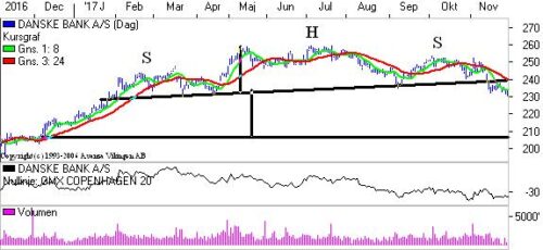 Danske Bank toppede i juli og er nu i faldende tendens. Studerer man formationen i Danske Bank, indikerer den en skulder-hoved-skulder formation, hvilket indikerer, at aktien skal ned i niveauet 210. Sidst Danske Bank var i 210 var tilbage i oktober 2016, hvor aktien etablerede en kortvarrig topformation i den stigende tendens.