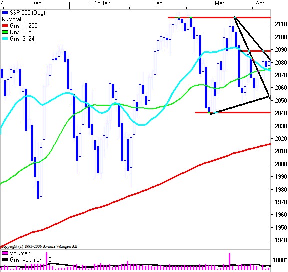 De korte indikatorer trækker op; men konsoliderer sig overordnet i en symmetrisk kile. Det viser samtidig at volatiliteten er ved at gå ud af de amerikanske aktier.