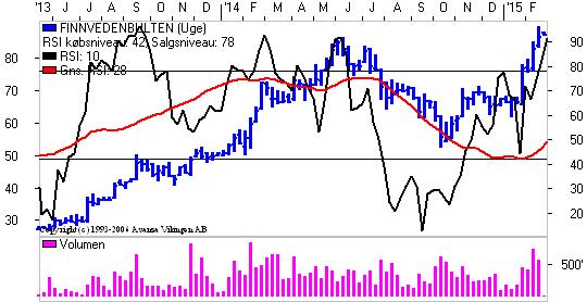 Bulten er brudt over den gamle top fra juni, og den stigende tendens trækker op i de to indikationsmodeller RSI og Momentum på ugebasis. Bulten fremlagde et regnskab i begyndelsen af februar, der viste en kraftig fremgang i omsætningen. Men resultat før skat er belastet af etablerings- og opstartsomkostninger. Aktiekursen er inde i en stigende trendkanal. Hæver målkursen til 94 og stop-loss til 83.