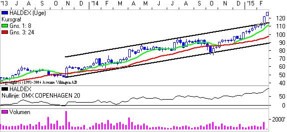 Haldex brød ligeledes igennem målkursen i denne uge, da selskabet leverer sit regnskab. Bollingerkanalen har været i køb siden begyndelsen af november. Hæver målkursen til 130 og stop-loss til 115.