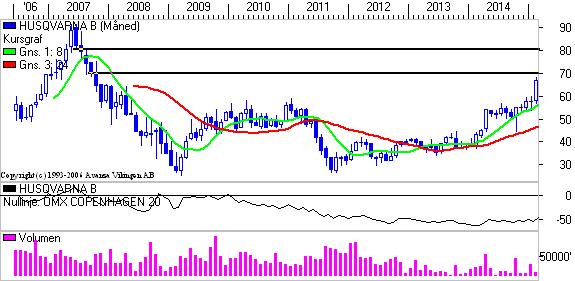 Husqvarna er brudt over modstandsniveauet 60 og er løbet voldsomt op i de seneste to uger. Kursen er ikke langt fra den gamle bund i september/oktober 2007, hvor aktien har etableret en faldende tendens, mens toppen var i 74,5. Hæver målkursen til 74,5 og stop-loss til 63.