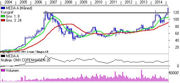 Meda er brudt over den gamle top fra årsskiftet 2006/07, der var oppe i niveauet 122. Efter bruddet af det tidligere topniveau er der muligheder for yderligere vækst. Sætter målkursen til 142 og sætter stop-loss til 124.