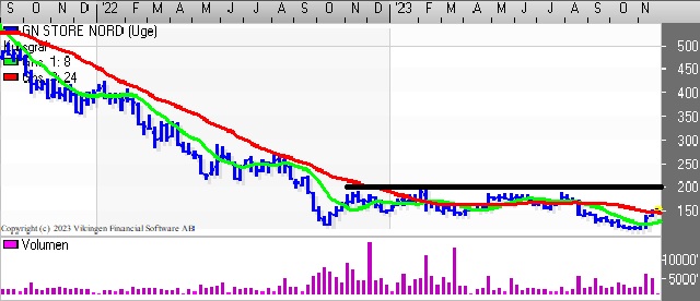 GN Store Nords regnskab trak kursen nordpå, hvilket betyder, at der er etableret købssignal i kursgrafen og Bollingerkanalen på dagsniveauet. Stigningen i aktien betyder, at der er etableret et gap i niveauet 124,25-129,10.