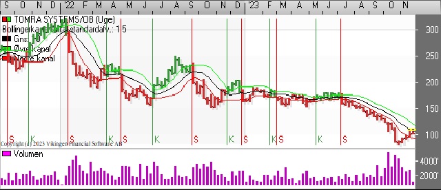 Tomra toppede i januar 2022 i niveauet 320 og bundede i slutningen af oktober i niveauet 80-81. Onsdag lukkede aktien i 104,05. Der er etableret købssignal på dagsniveauet i kursgrafen med de glidende gennemsnit på 8 og 24 dage. Bollingerkanalen etablerede på dagsniveauet et købssignal i begyndelsen af november.