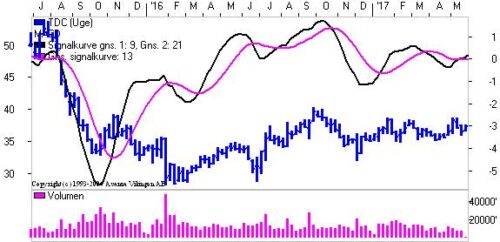 Der er igen fokus på telesektoren, og det har givet flere nye signaler, også i danske TDC. Aktien har været i en svagt stigende tendens siden bunden i januar/februar 2016, hvor aktien blev handlet i 29-30 kr. I dag handles aktien i niveauet 35-38,5 efter en kort tur i niveauet 40 i september. Kursudviklingen ligger i en stigende trendkanal og signalmodellerne er i køb. Det lange glidende gennemsnit ligger i niveauet 36,5 som en støttelinie. Der er en positiv tendens i de tre indikationsmodeller.