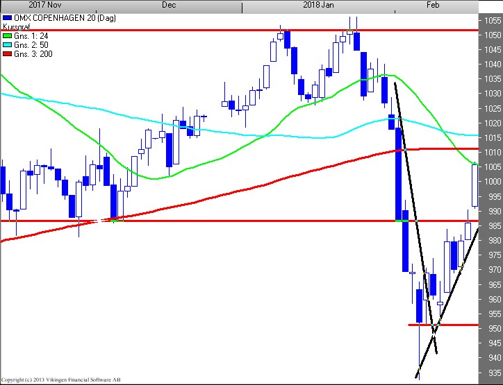 Ser BørsUdsigten på dagschartet for C20 (1.006), er der tale om en rebound i en faldende nedtrend. Denne chartformation er oftest en negativ fortsættelse (bryder ned). Rebounden (konsolideringen) kaldes oftest ”Fools Rally”, da der er tale om køb, for at dække det tab der opstod ved salgssignalet. Chartformationen bliver først annulleret når vi ser en højere eller et brud af den gamle toplinie i 1.052 niveauet.
