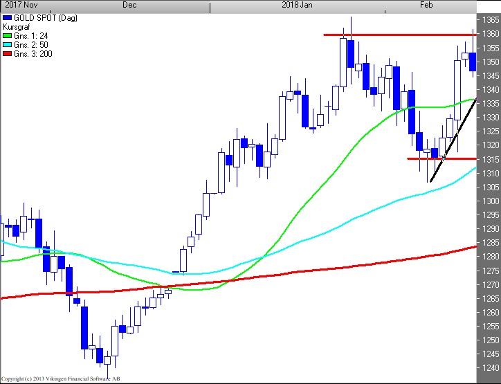 Ser BørsUdsigten på dagschartet for guld (1.347), er der tale om en test af konsolideringen mellem 1.345 niveauet og 1.365 niveauet. Rent købesignal ved brud af 1.360 niveauet. Alt tyder på at guldprisen skal yderligere op.
