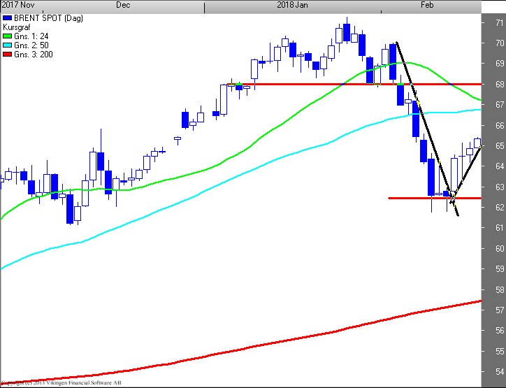 Ser BørsUdsigten på dagschartet for UK Brentkvaliteten (65,3), fik vi en midlertidig bund – og et vendesignal i 62,5 niveauet. Nyt EXIT signal ved brud af 62,5 niveauet (oppefra). Købesignal udløst ved bruddet af 63 niveauet, og bekræftet ved bruddet af 64,5 niveauet.