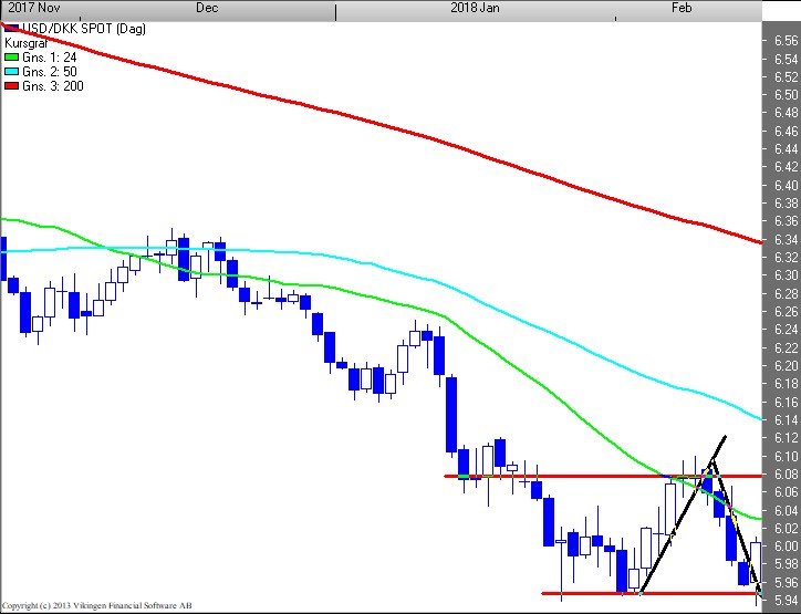 Ser BørsUdsigten på dagschartet for valutakrydset USD/DKK (6,00), afviste 5,95 niveauet. Det betyder et spekulativt købesignal ved bruddet af 5,96 niveauet. Der tale om en midlertidig bundformation (sidelæns konsolidering). Bundlinien ligger i 5,95 niveauet, og toplinien i 6,08 niveauet.