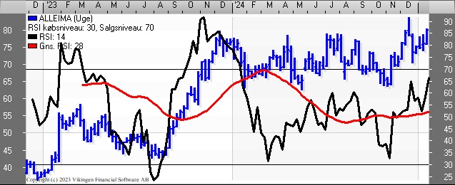 Den positive udvikling i aktiekursen løfter de tre indikationsmodeller på ugebasis. RSI er over 70. Momentum er stigende og ligger over det glidende gennemsnit på ugebasis. MACD viser også en stigende tendens og ligger over middelværdien 0 på ugebasis.