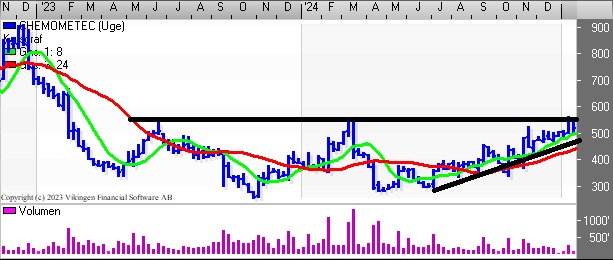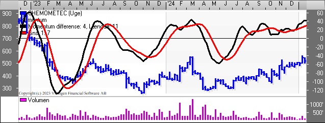 Derfor løfter vi kursmålet og stop-loss for vores ChemoMetec. Teknisk set befinder aktien sig i en stigende trend, som har været gældende siden bunden i juni, hvor aktiekursen lå på 300 mod dagens kurs i 517 – 525.