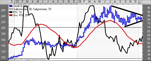 Forsvarsfirmaet SAAB og det svenske forsvar arbejder på at udvikle autonome dronesværme, som nemt kan bruges af soldater i felten. Teknisk handles SAAB-aktien vandret i intervallet 200–260, hvilket har været tilfældet siden marts 2024. Der er købssignal i kursgrafen, mens Bollingerkanalen indikerer salg.