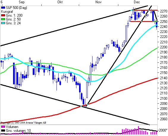 Ser BørsUdsigten på dagschartet for S&P500 (2.239), brød chartet ud af den sidelæns tertiære konsolidering (basen), hvor toplinien lå på 2.272 niveauet og bundlinien i 2.250 niveauet. Det tertiære salgssignal blev udløst ved bruddet af 2.250 niveauet. Udbrud fra en base skal følges.