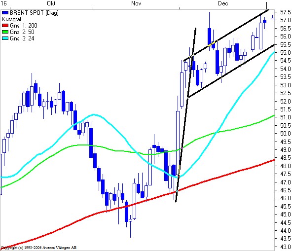 Ser BørsUdsigten på dagschartet for UK Brentkvaliteten (57,1), er der tale om en konsolideringskanal, der oftest bryder på nedsiden. Det kunne godt understøtte BørsUdsigten’s fundamentale vurdering.