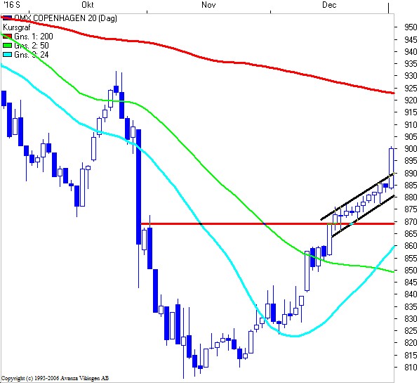 Ser BørsUdsigten på dagschartet for C20 indekset (900), er der tale om et meget stærkt købesignal ved accelerationen ud af den stigende trendkanal ved bruddet af toplinien i 890 niveauet (oftest brydes der ned). Indeksmålet er fortsat 925 niveauet – og der lægges op til en test af 1.000 niveauet i løbet af de næste par måneder. Brydes 1.000 niveauet ses 1.200 i løbet af de næste 12 til 24 måneder.