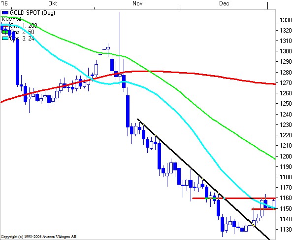 BørsUdsigten ser en midlertidig bund i guldprisen. Tertiært er der tale om en konsolidering, med en bund i 1.148 niveauet, og en toplinie / nyt købesignal ved brud af 1.160 niveauet.