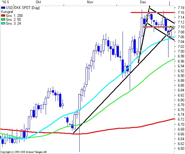 Ser BørsUdsigten på dagschartet for USD/DKK (7,09) ligger er der tale om en konsolideringsformation, der oftest bryder ud OP!
