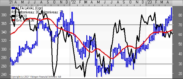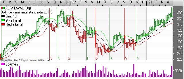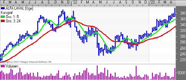 Teknisk er Alfa Laval i en stigende trendkanal og det har stået på siden maj/juni sidste år, hvor aktien blev handlet i niveauet 240-260. Hæver målkursen og stop-loss på Alfa Laval til 430 og 340.