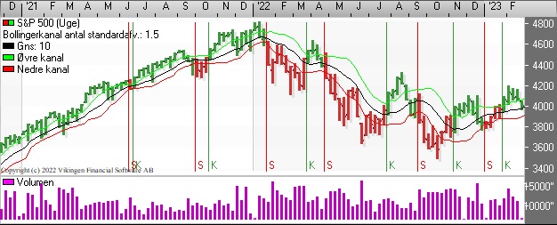 På ugebasis er der fortsat købssignal i Bollingerkanalen. De glidende gennemsnit på 8 og 24 uger etablerede et Golden Cross i januar. Det lange glidende gennemsnit ligger i niveauet 3900 som en støttelinie.