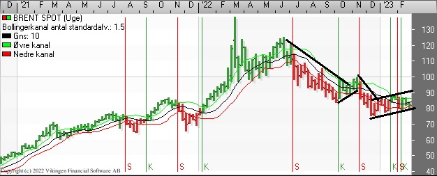 Brent Spot bevæger sig fortsat vandret i niveauet 80-88. På dagsniveauet er der etableret et salgssignal i de glidende gennemsnit i begyndelsen af februar og Bollingerkanalen har været i salg i 3 dage.