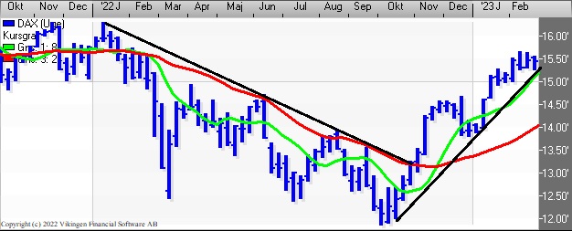 På ugebasis er der købssignal i Bollingerkanalen som netop er blevet etableret i denne uge. Det lange glidende gennemsnit ligger over det korte glidende gennemsnit på ugebasis, hvilket indikerer, at man skal afvente udviklingen.