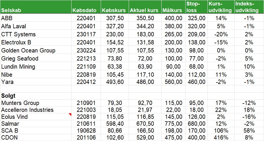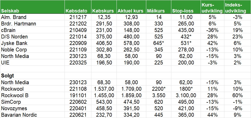 Den danske portefølje har år til dato givet et afkast på 5,6 pct. mod C25-indekset som har givet et afkast på 5,2 pct. Har solgt North Media da stop-loss er blevet brudt. Hæver stop-loss og målkursen på Jyske Bank. Hæver stop-loss på D/S Norden.