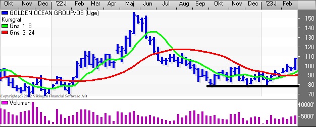Golden Ocean Group har etableret købssignal i midten af januar i flere modeller. Den positive udvikling trækker op i de tre indikationsmodeller på ugebasis. RSI er over 70 og MACD er over middelværdien 0 og i en stigende tendens. Den samme tendens ser man i Momentum på ugebasis.