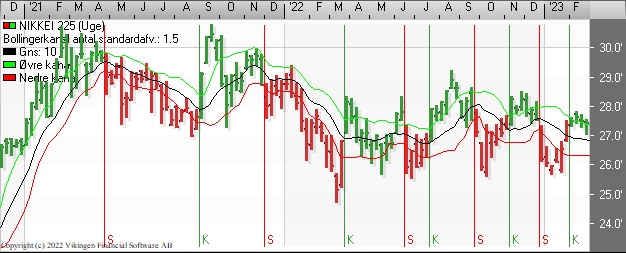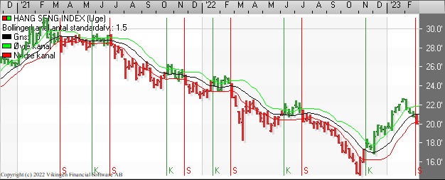Hang Sang har etableret et salgssignal på dagsniveauet og der har været salgssignal fra begyndelsen af februar både i Bollingerkanalen og de glidende gennemsnit. På ugebasis er der signalet skiftet til salg i den uge. Tilbagefaldet i kursen de seneste par uger har fået de tre indikationsmodeller til at falde tilbage. Momentum har været i en faldende tendens og det samme har RSI og MACD. RSI har ramt 60 og MACD er over middelværdien på 0. Nærmeste støtteniveau er ved 20.000, mens nærmeste modstandsniveau er ved 23.000.