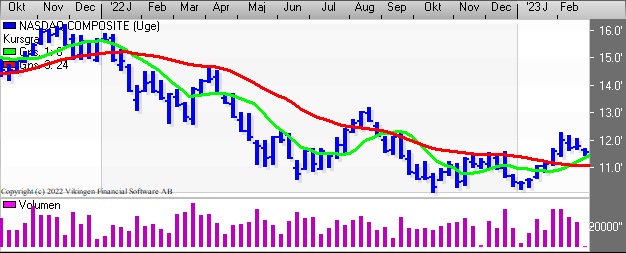 På ugebasis er der fortsat købssignal i Bollingerkanalen og de glidende gennemsnit på 8 og 24 uger har etableret et Golden Cross for 1 uge siden. Det lange glidende gennemsnit ligger i niveauet 11.000 som en støttelinie.