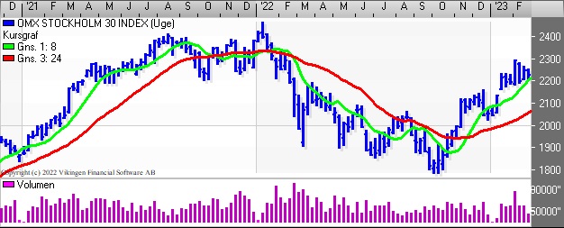 OMX Stockholm 30 Nærmeste modstandsniveau er fortsat i niveauet 2300 og den er endnu ikke blevet brudt. På dagsniveauet er der salgssignal i Bollingerkanalen, mens de glidende gennemsnit holder fast i købssignalet fra begyndelsen af januar.