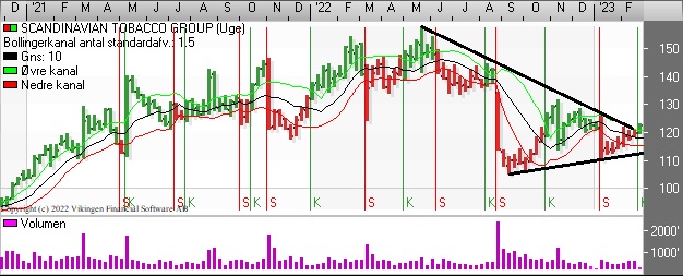 Teknisk har STG genfundet den stigende tendens og handles nu i niveauet 120-122. Den faldende tendens er brudt og der er stigende bunde med en i september i niveauet 105 og den næste i 110 i januar. Bollingerkanalen har etableret et købssignal i midten af januar og de glidende gennemsnit på 8 og 24 har etableret et Golden Cross ved månedsskiftet.
