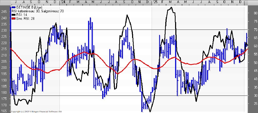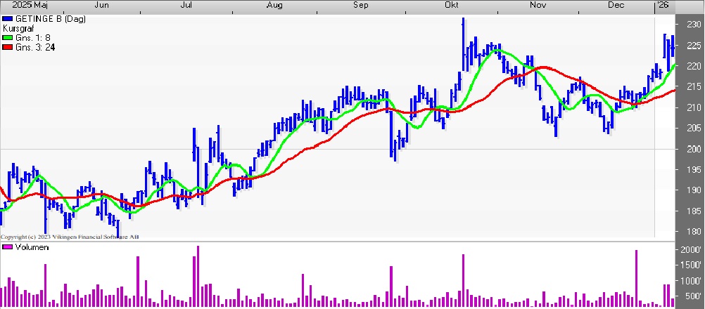 Getinge-aktien har handlet vandret i niveauet 180-230 siden midten af 2023, hvor aktien tog et dyk fra niveauet 240-250. Tilbage i 2020-2021 var aktiekursen oppe i niveauet 350-400.