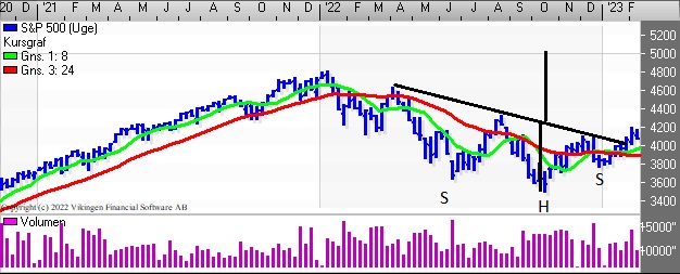 Har S&P 500 etableret en omvendt skulder-hoved-skulder formation, og holder den formation, så skal markedet op i 5.000. Der er etableret et købssignal i Bollingerkanalen i midten januar på dagsniveauet. De glidende gennemsnit på 8 og 24 dage har etableret et Golden Cross i midten af januar.