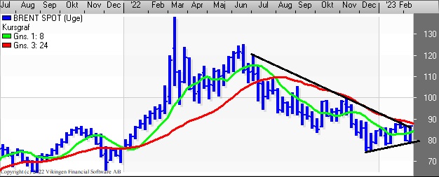 Brent Spot handles med en svagt stigende tendens. De seneste bunde er i en stigende tendens, så der er etableret en svagt stigende tendens i olien. Der er en positiv tendens i de tre indikationsmodeller på ugebasis. RSI er tæt på at 50. MACD er fortsat under middelværdien på 0. Der er en stigende tendens i Momentum på ugebasis. Nærmeste modstandsniveau er ved 90 og herefter i niveauet 95, mens der er støtte i niveauet 80 og herefter i 85. Holder fast i vores Noble i den danske portefølje.