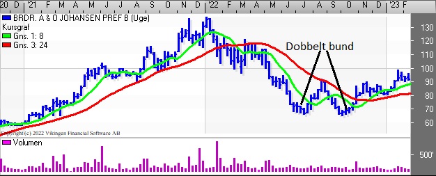 Brdr A&O Johansen tester modstandsniveauet 100 og skal den stigende tendens i aktien holde, skal kursen igennem modstandsniveauet. Brdr A&O Johansen har etableret en dobbelt bundformation med en bund i juli og ved månedsskiftet september/oktober. Bollingerkanalen har etableret et nyt købssignal for 5 dage siden og de glidende gennemsnit på 8 og 24 dage har etableret et Golden Cross i begyndelsen af januar.